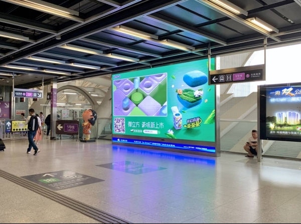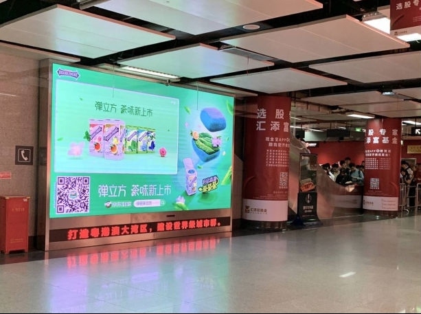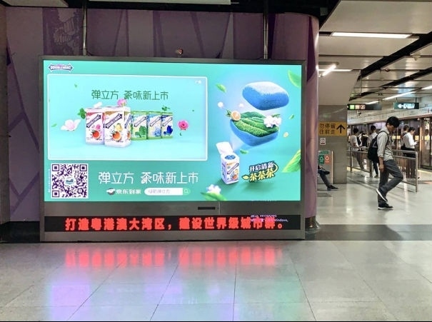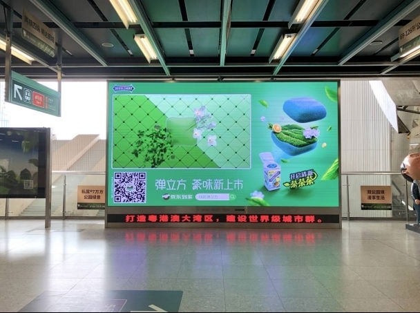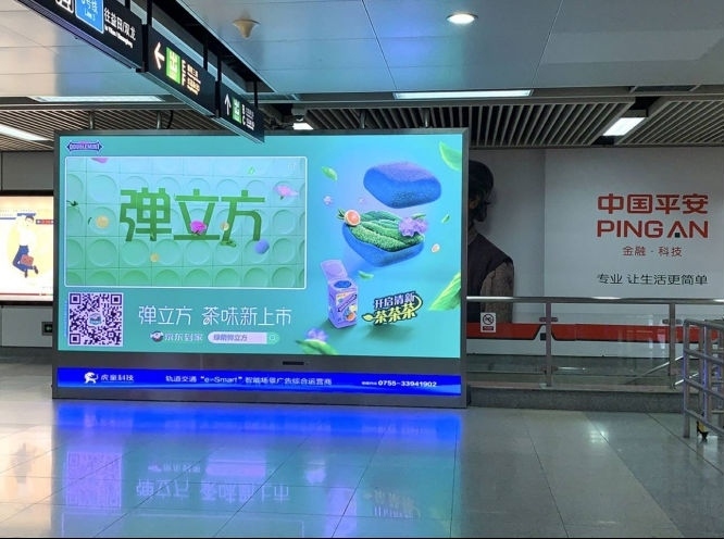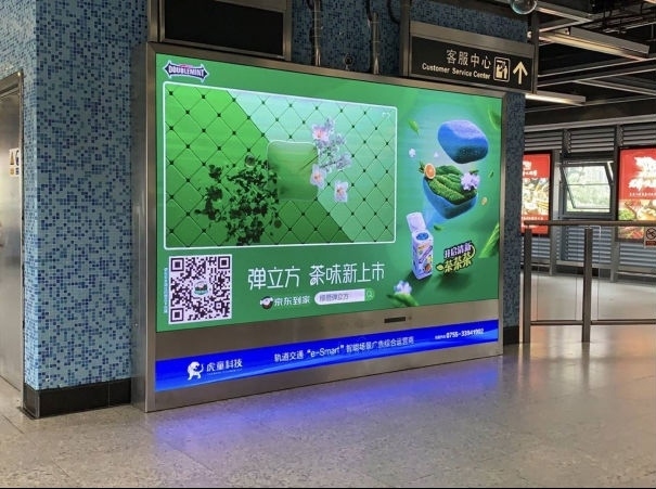 虎童科技作为深圳地铁全线首创体感互动智能传播的广告运营商,独家开发的智能大屏面积占据地铁客流要道,4k高清画质及16:9影像画面比例使绿箭“弹立方”的“弹”与“茶香”展现得灵活灵现,使“弹力十足”的清新茶香几乎溢出画面,脱框而出。
