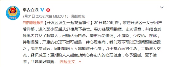 湖北省十堰市公安局十堰经济开发区公安分局官方微博7月31日晚发布警情通报称,7月30日晚20时许,家住开发区一女子因产后抑郁,进入某小区后从27楼跳下身亡。警方经现场勘查、走访调查,并结合其通讯内容及了解家人,已确认为自杀。