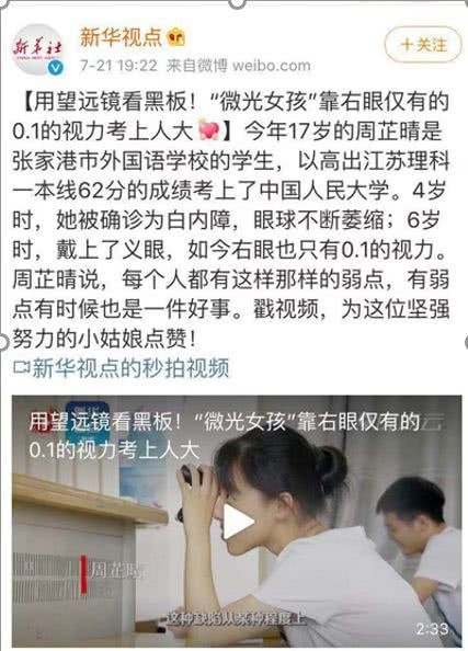 前几天,考入中国人民大学的江苏女孩周芷晴4岁患白内障,6岁左眼彻底失明,仅剩下右眼0.1的视力,整个世界都是一篇模糊。