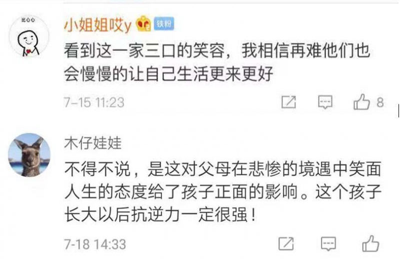 “不得不说,是这对父母在悲惨的境遇中笑面人生的态度给了孩子正面的影响。这个孩子长大以后抗逆力一定很强!”