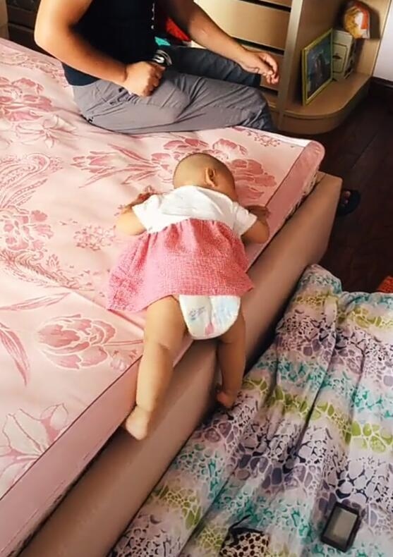 这个宝宝,使用腿部的力气,鲤鱼打挺的方法让小身子往床下移动,最终也成功了,不过他应该知道爸爸就在床边上护着他,自傲心有了很大的进步,假如是独自下床,估量不会测验这个姿态吧。