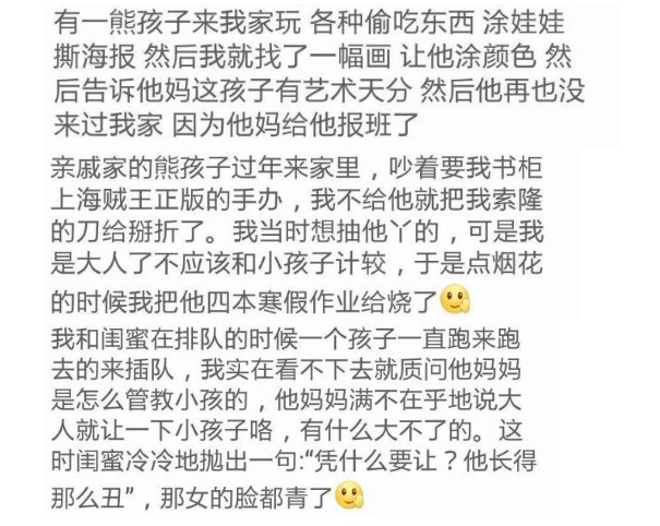 熊孩子真的是这个世界上最令人讨厌的生物之一,并且大部分情况下,这个熊孩子是亲戚家的孩子,说不得,骂不得,打不得,可是他却能把你气出内伤来,尤其是熊孩子背面大多还有一个熊家长,几乎便是全家都不讲理……