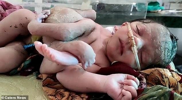 这名女子叫拉吉(Raju),本年24岁,她和老公急迫盼望着他们第一个孩子的出世。当地时间周五晚上2点46分,拉吉在医院天然临产,迎来她的一对龙凤胎新生儿 。男婴十分的健康,而女婴却比正常人多了一双腿,和一只手。女婴的其间一条腿覆盖着她自己的腹部。