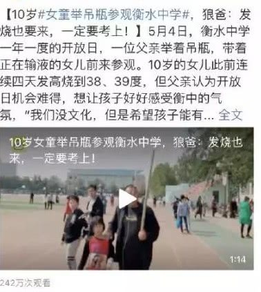 前几个月行将高考的时分出了一个新闻,说是全国闻名的衡水中学来了一对父女,当天这对父女冒着炎炎酷日来到衡水中学观赏。值得注意的是女孩仅仅只要十岁,其时应该是患病了,所以她还输着液,而她的父亲在一旁举起吊瓶。