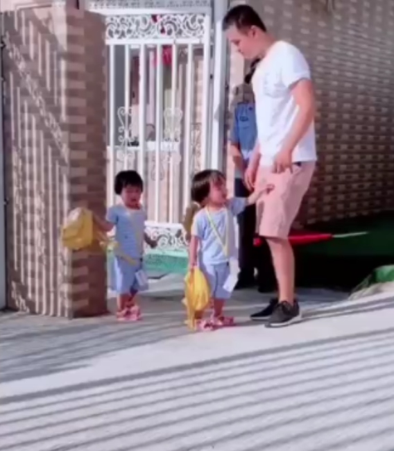 爸爸笑着看着三个女儿,无法地把女儿扔在地上的书包捡了起来。周围保安大叔刚好目击了这样风趣的情形,直接笑了,三双胞胎女儿实在太心爱了,就连气愤都这么心爱。