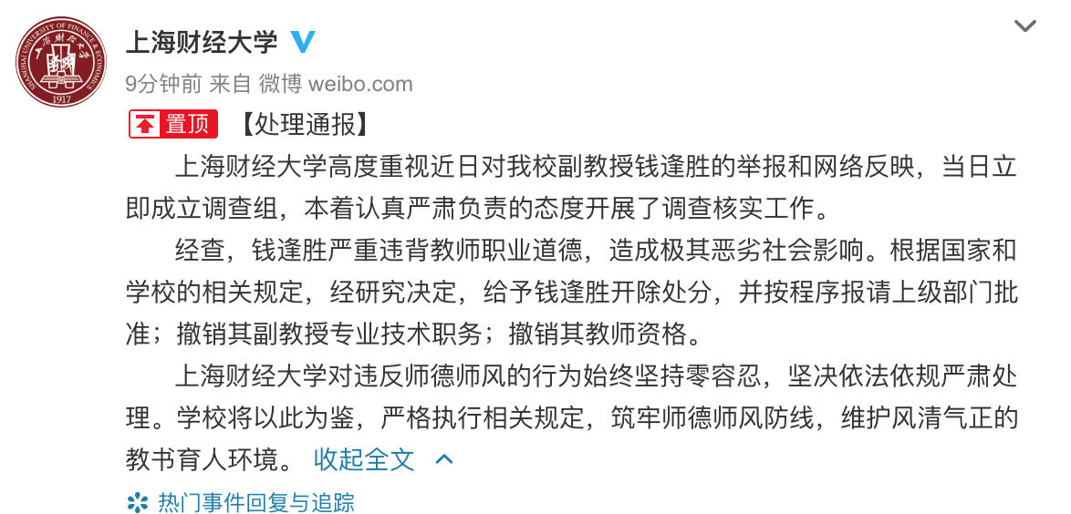 当天晚间,上海财经大学官方微博发布声明,称关于网上呈现有关钱某的师德师风问题信息,已建立查询组,打开查询作业,“一旦查实,将依法依规严肃处理”。3日后,上海财经大学作出开除处置。