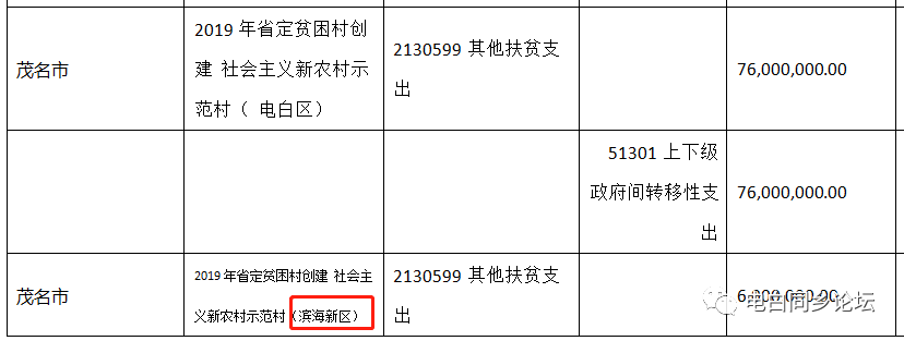 从该《告诉》的附件《2019年省定贫困村创立社会主义新乡村示范村资金安排表》可以正常的看到:茂名共取得3.52亿资金(其间,茂南区3200万, 高新区200万,信宜市8800万, 电白区7600万,滨海新区600万,高州市7200万,化州市7600万。)