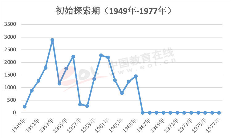 1949年至1977年间,全国硕士研究生招生人数最初不足500人,在1953年招生人数达到近3000人后,1957年招收研究生方式由入学考试改为推荐。1965年招生人数为1456人,之后停止研究生招生长达12年。1966年开始,全国停止招收研究生,直至1978年恢复。