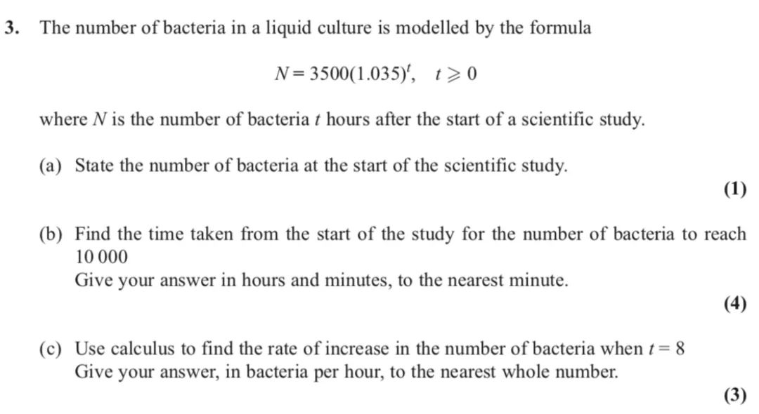 The requirement to ‘Use Calculus’ was not followed by a significant minority who just worked out N when t was 8, or divided that number by 8, Those who correctly differentiated almost always got an acceptable answer. Those who incorrectly differentiated N, usually to , and then put t=8 could only gain one method mark for this part.